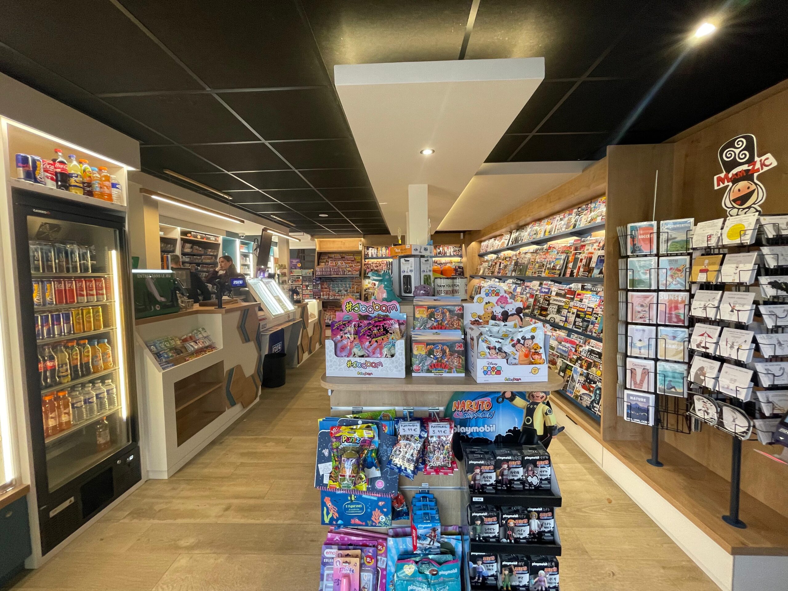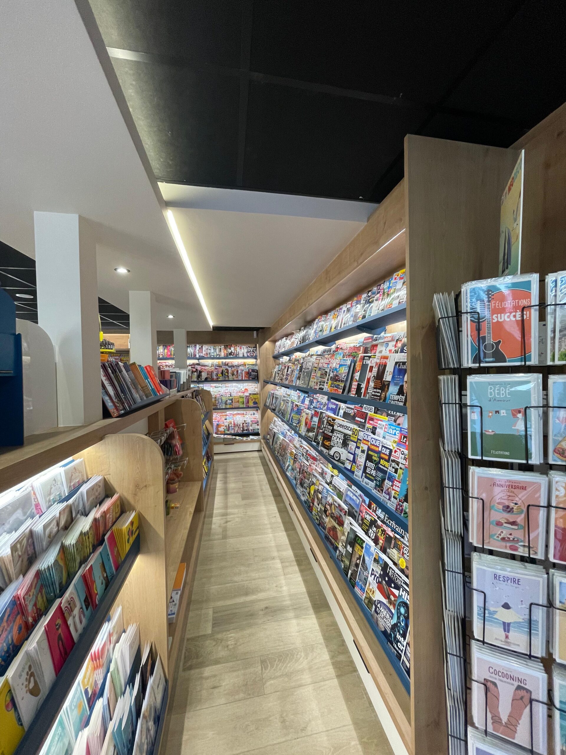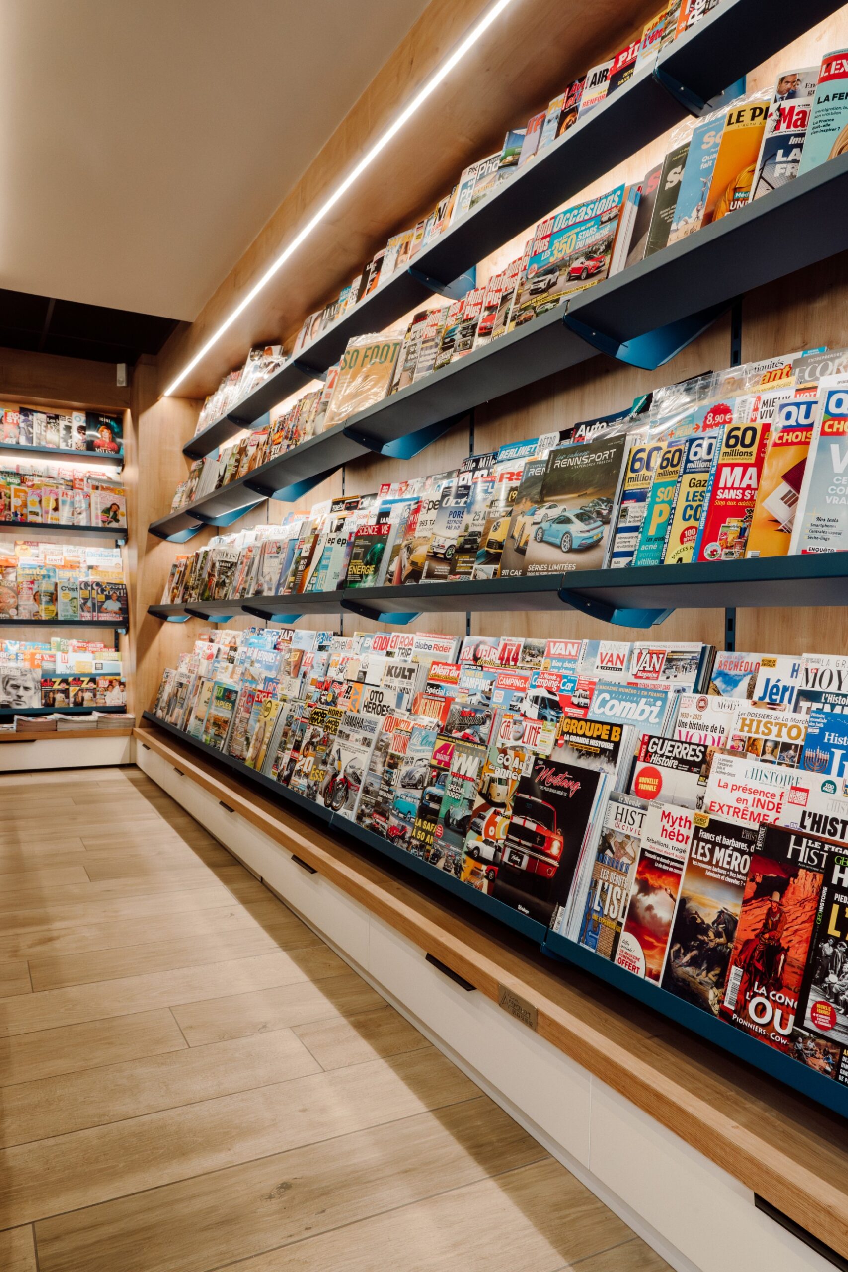 Le point fort de ce projet : un linéaire presse entièrement repensé et mis en valeur. Véritable élément central de l’espace, il se distingue par un éclairage intégré, des coloris dynamiques et une conception sur mesure. Ce mobilier, à la fois fonctionnel et attractif, attire le regard, facilite l’accès aux produits et accompagne naturellement le parcours client.